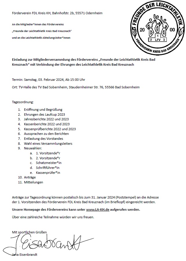 Liebe Vereinsvertreterinnen und -vertreter der Mitgliedsvereine im Förderverein „Freunde der Leichtathletik“ des Kreis Bad Kreuznach, liebe Mitglieder,