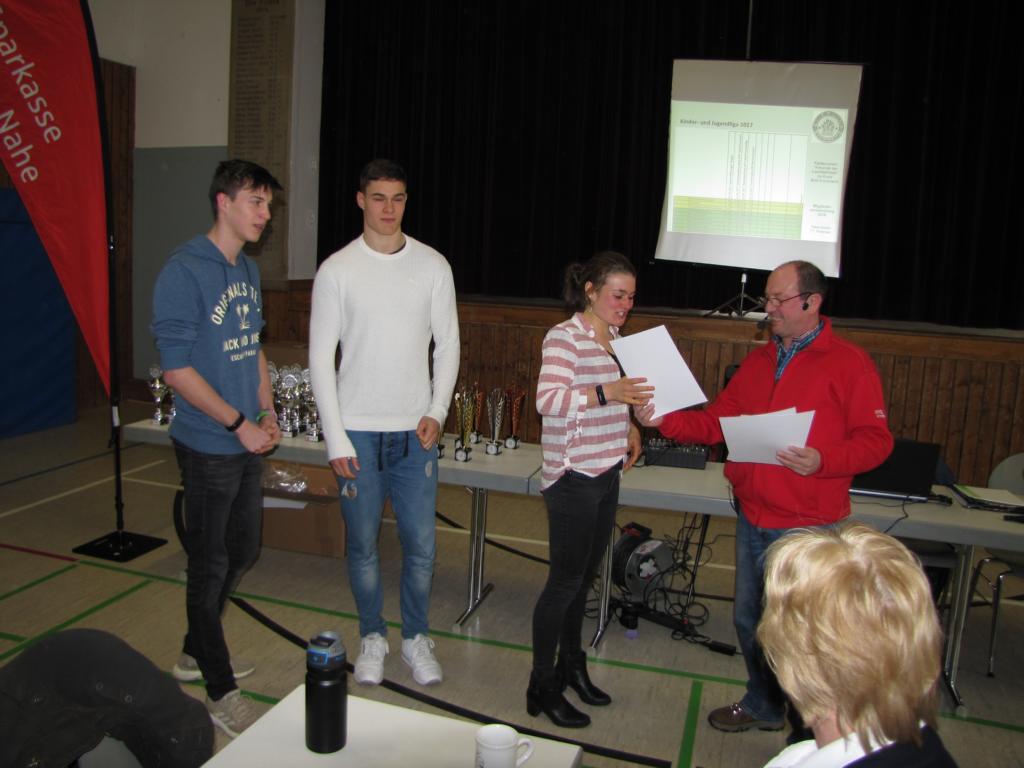 Der Top Act am Kreistag waren natürlich die Auszeichnungen der Leichtathleten des Jahres 2017. Als Berechnungsgrundlage für die Auswertung und somit der Platzierungen werden die Ränge der Sportler herangezogen, die sie in der Bestenliste des Leichtathletik-Verbandes 2017 errungen hatten. In der Männerklasse konnte sich Fabian Meyer von der TuS Kirn mit 17 Punkten klar absetzen. Ihm folgten seine Vereinskameraden Lennox Düren, Lio Graf, Bernhard Setz und Pierre-André Holderbaum mit 6 Punkten. In der männlichen Jugendklasse U20 wurde mit 34 Punkten Nelson Rück von den Lauffreunden Naheland Leichtathlet des Jahres 2017. Auf Rang 2 folgte ihm Abdullahi Bare-Kuulow vom TV 1867 Bad Sobernheim mit 22 Punkten. Bernhard Setz von der TuS Kirn kam mit 19 Punkten auf den 3. Platz.